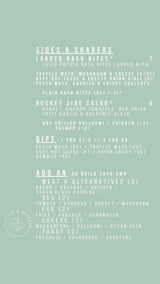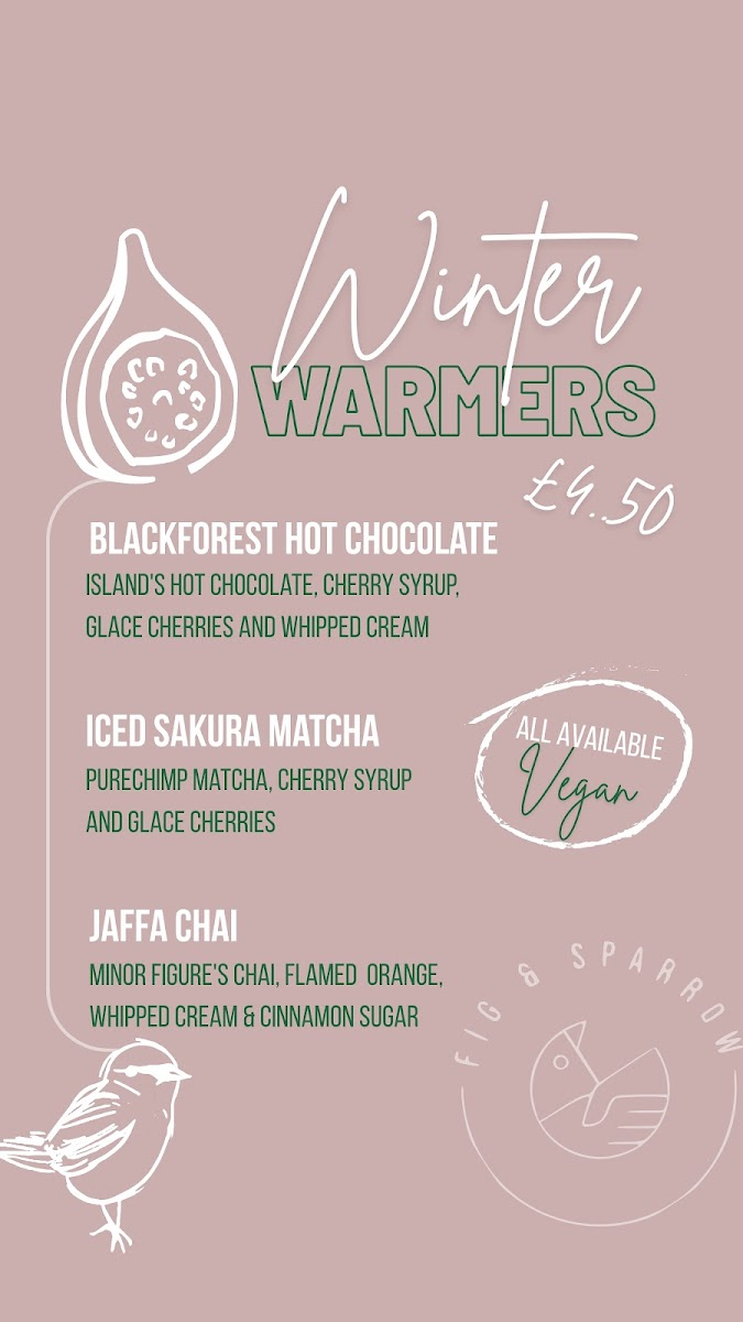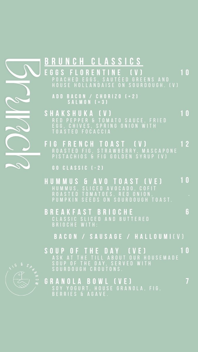 Welcome to Fig Sparrow, where every bite tells a story! Nestled in the heart of Manchester at 20 Oldham St, our menu is a vibrant celebration of flavors, featuring mouthwatering dishes and expertly crafted beverages that are sure to tantalize your taste buds. Start your day with our Sparrow Vegan Breakfast or savor the rich flavors of our Turkish Eggs on toast. Don't miss our crowd favorites like the creamy Hummus & Avo Toast or the indulgent Avocado Toast with Salmon. For coffee lovers, our Cortado and Flat White are perfect companions to your meal, while our sweet offerings like the Coffee Cake and Raspberry Brownie provide just the right touch of dessert bliss. Whether you’re in the mood for a cozy cappuccino or a refreshing cold brew, we invite you to explore the Fig Sparrow Menu and indulge in all the delightful specialties that await you!